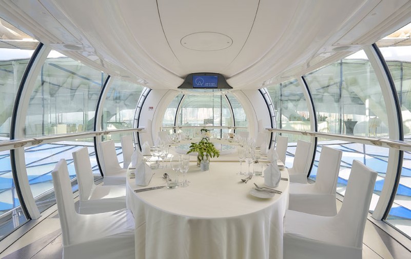 · Кабины оборудованы системой климат-контроля, панорамными окнам и их можно бронировать для любых мероприятий, ужинов или свадеб.