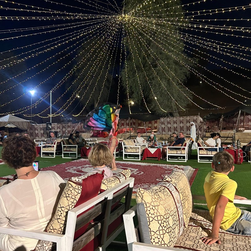 На сцене — танец живота, чарующие арабские мелодии и настоящее фаер-шоу, от которого перехватывает дыхание. Это не просто выступление, а настоящее магическое действие под звёздным небом.
